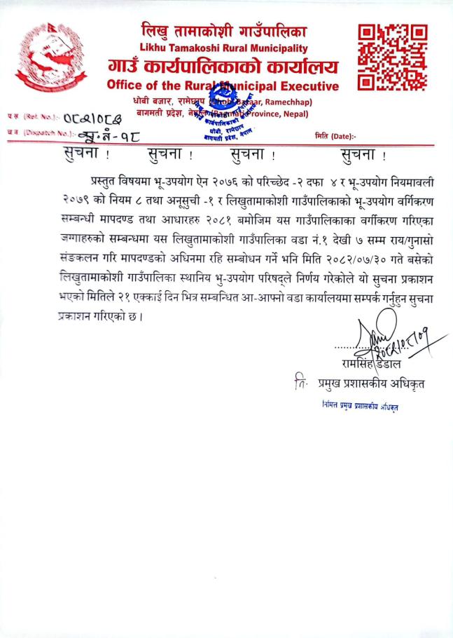 गाउँपालिकाको प्रशासकीय भवनको लागि नि शुल्क जग्गा उपलब्ध गराउने सम्बन्धी सुचना ।