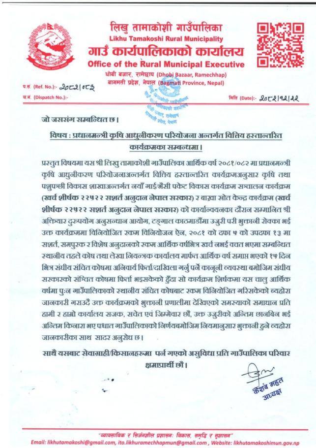 » प्रधानमन्त्री कृषि आधुनीकरण परियोजना अन्तर्गत वित्तिय हस्तान्तरित कार्यक्रमका सम्बन्धमा ।