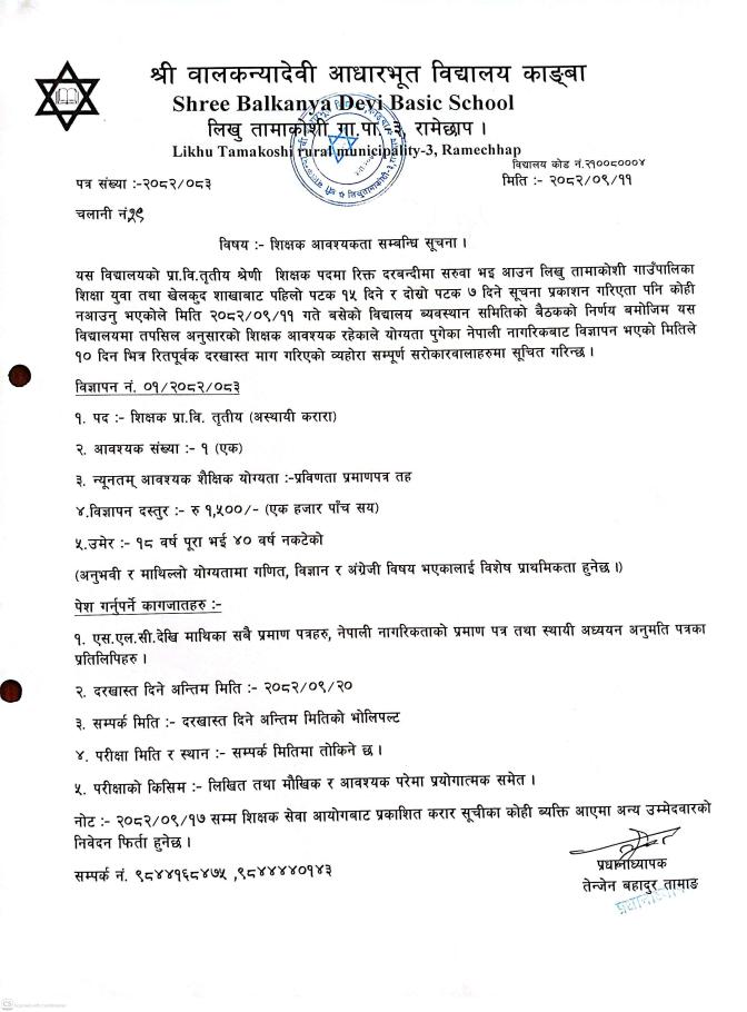 शिक्षक आवश्यकता सम्बन्धी सूचना ।