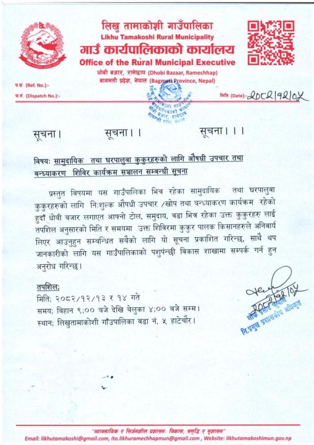 » सामुदायिक तथा घरपालुवा कुकुरहरुको लागि औषधी उपचार तथा बन्ध्याकरण शिविर कार्यक्रम सञ्चालन सम्बन्धी सूचना