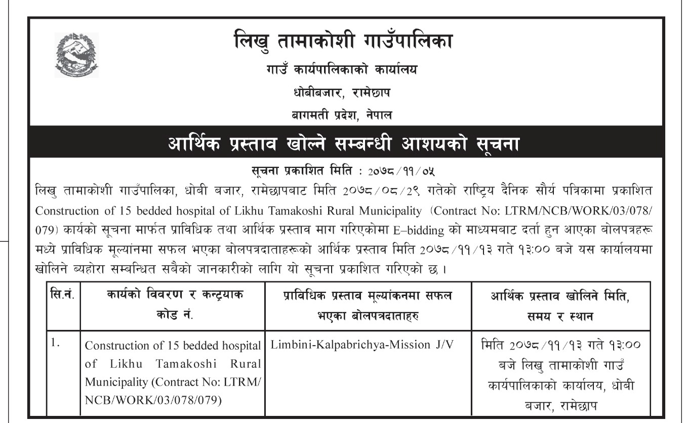 » आर्थिक प्रस्ताव खोल्ने सम्बन्धी आशयको सुचना