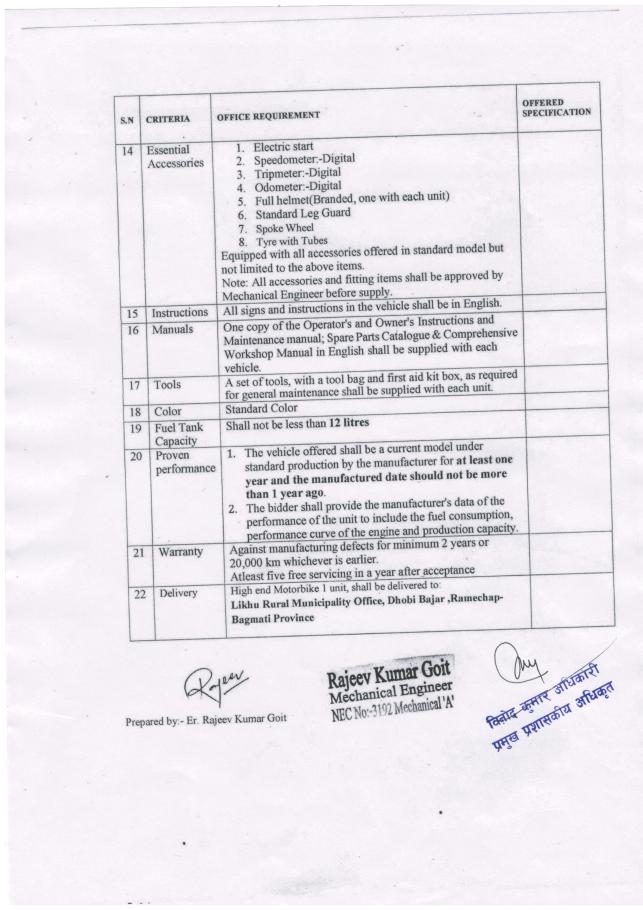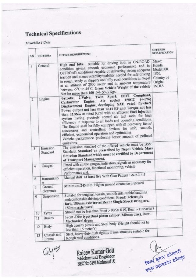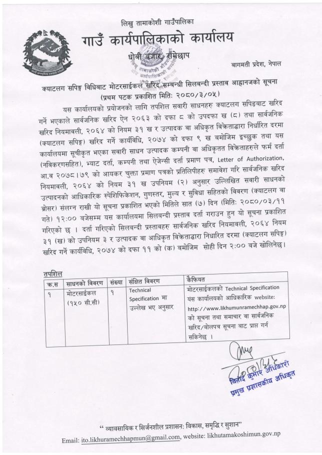 क्याटलग सपिङ्ग विधिबाट मोटरसाईकल खरिद सम्बन्धी सिलबन्दी प्रस्ताव आह्वानको सूचाना । (प्रथम पटक प्रकाशित मितिः २०८०/०३/०५)