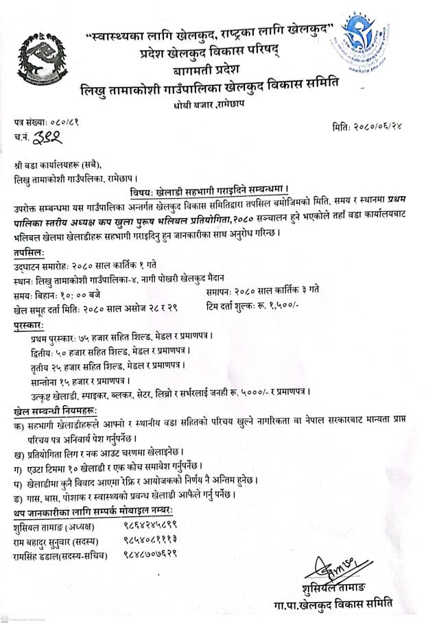 » खेलाडी सहभागी गराइदिने सम्बन्धमा । श्री वडा कार्यालयहरु सबै, लिखु तामाकोशी गाउँपालिका, रामेछाप ।