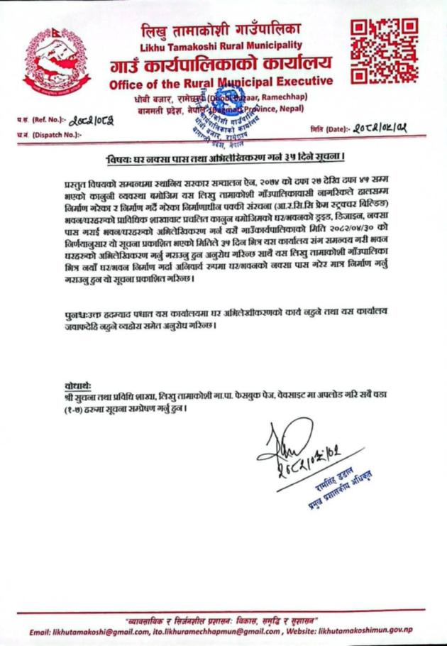 घर नक्सा पास तथा अभिलेखिकरण गर्न ३५ दिने सूचना ।