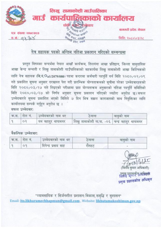 नेत्र सहायक पदको अन्तिम नतिजा प्रकाशन गरिएको सम्बन्धमा ।