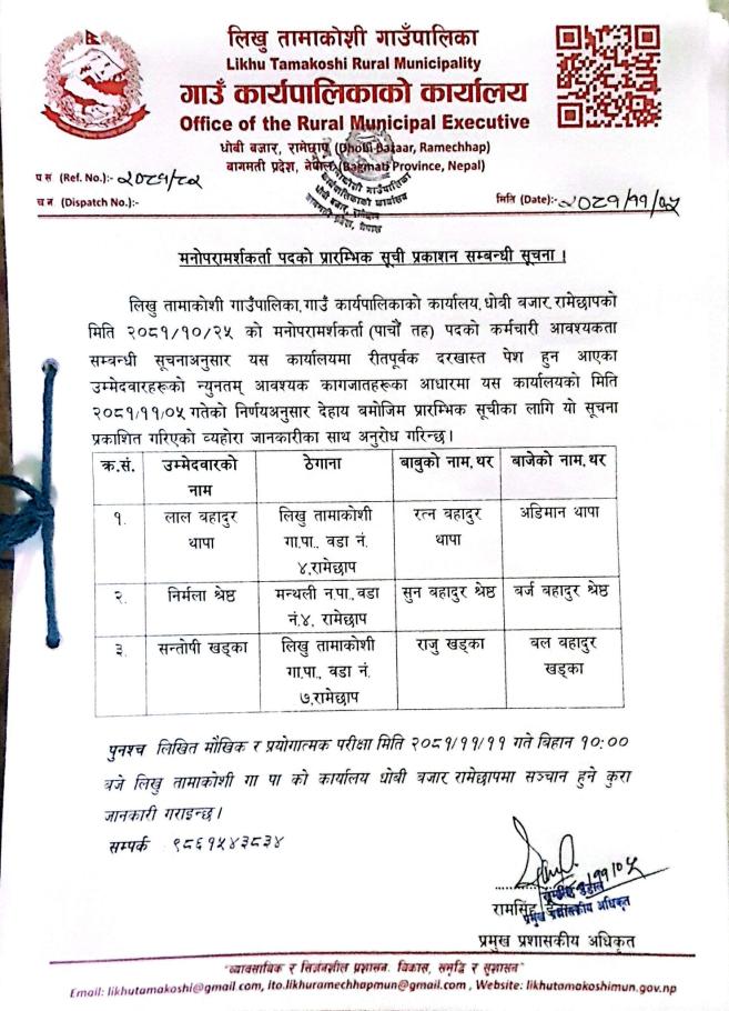 मनोपरामर्शकर्ता पदको प्रारम्भिक सूची प्रकाशन सम्बन्धी सूचना !