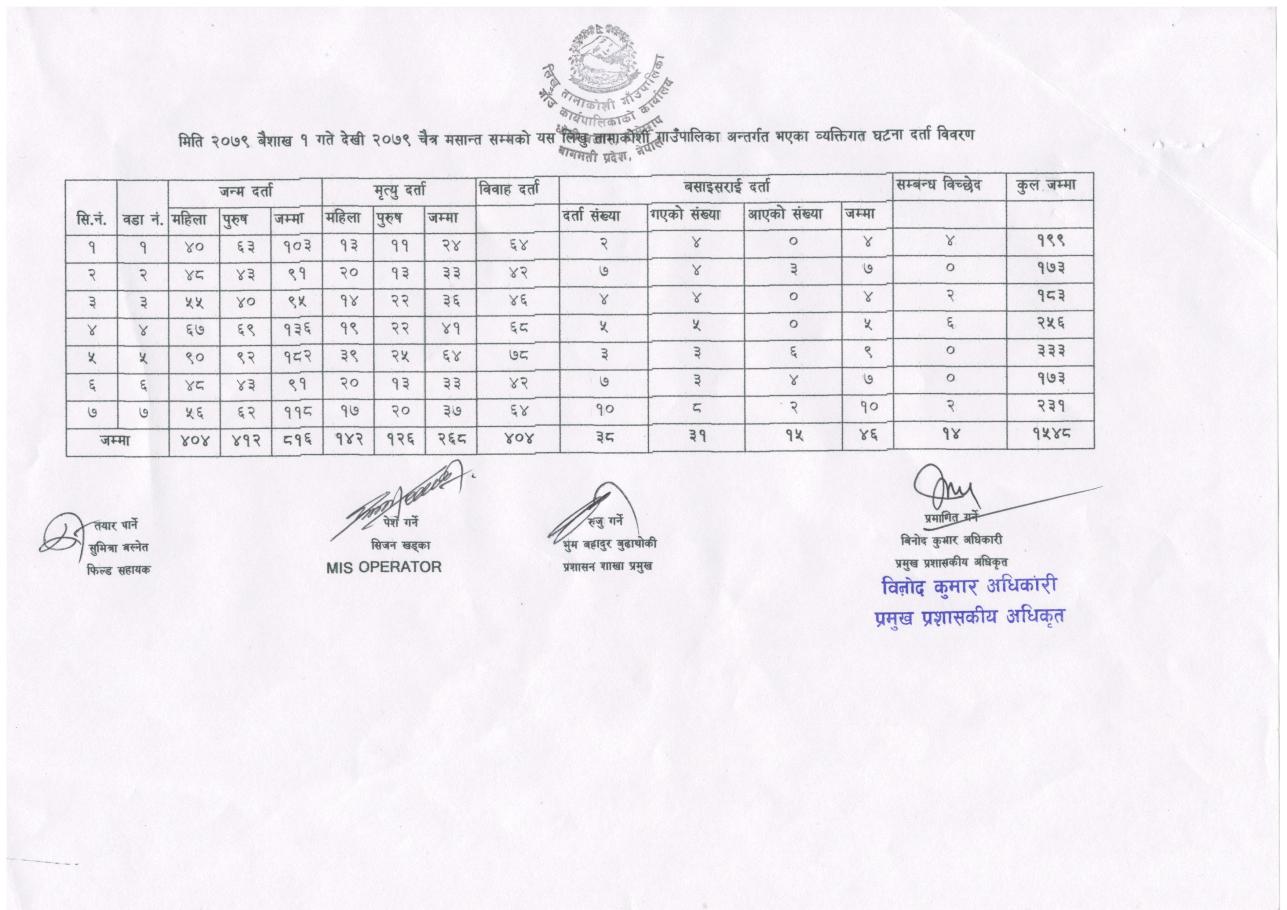 मिति २०७९ बैशाख १ गते देखी २०७९ चैत्र मसान्त सम्मको यस लिखु तामाकोशी गाउँपालिका अन्तर्गत भएका व्यक्तिगत घटना दर्ता विवरण ।