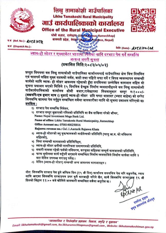 » व्याक-हो लोडर र एक्साभेटर भाडामा लिनका लागि दरभाउ पेस गर्ने सम्बन्धि अत्यन्त जरुरी सूचना