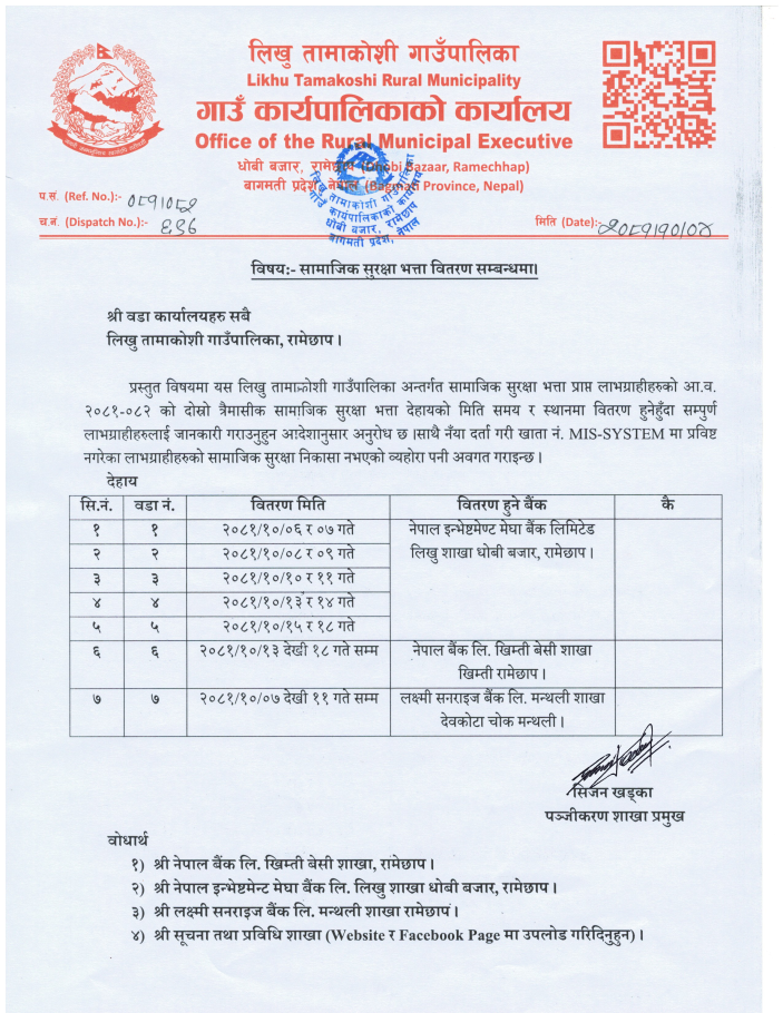 प्रस्तुत विषयमा यस लिखु तामाकोशी गाउँपालिका अन्तर्गत सामाजिक सुरक्षा भत्ता प्राप्त लाभग्राहीहरुको आ.व. २०८१-०८२ को दोस्रो त्रैमासीक सामाजिक सुरक्षा भत्ता देहायको मिति समय र स्थानमा वितरण हुनेहुँदा सम्पुर्ण लाभग्राहीहरुलाई जानकारी गराउनुहुन आदेशानुसार अनुरोध छ ।साथै नँया दर्ता गरी खाता नं. MIS-SYSTEM मा प्रविष्ट नगरेका लाभग्राहीहरुको सामाजिक सुरक्षा निकासा नभएको व्यहोरा पनी अवगत गराइन्छ ।