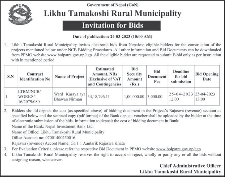 Invitation for Bids LTRM/NCB/WORKS/16/2079/080 Ward Karayalaya Bhawan Nirman