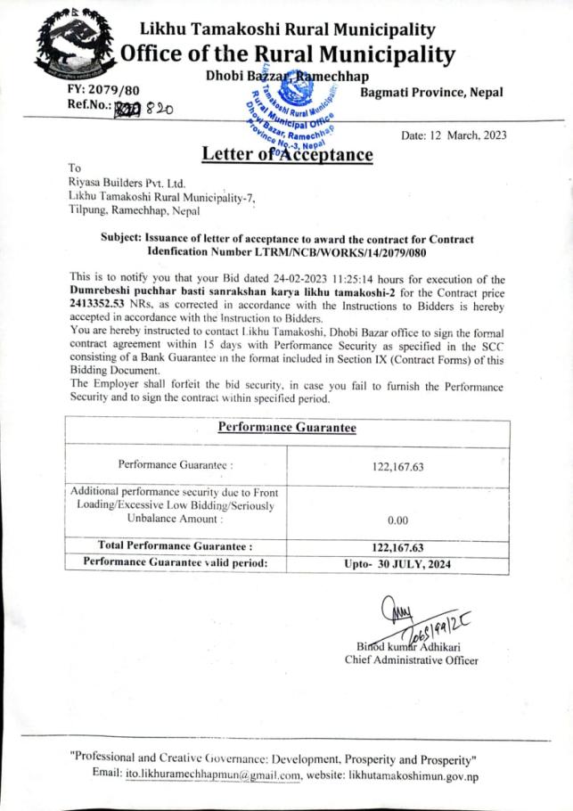 Letter of Acceptance (LTRM/NCB/WORKS/14/2079/080 Dumrebeshi puchhar basti sanrakshan karya likhu tamakoshi-2)