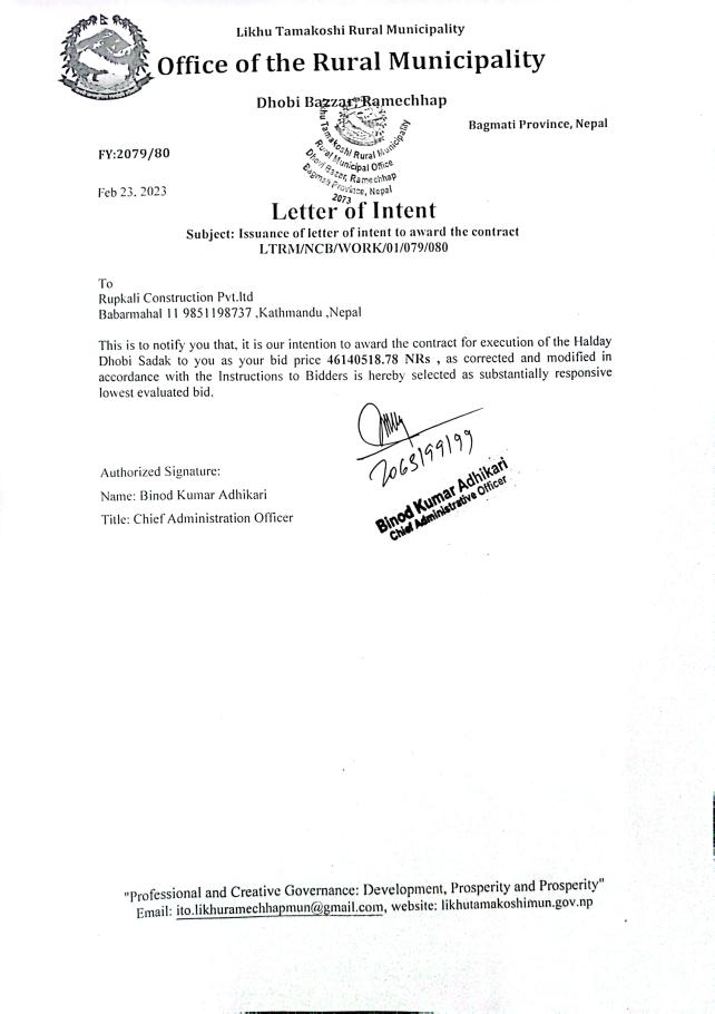 » Letter of Intent (LTRM/NCB/WORK/01/079/080 Halday Dhobi Sadak)