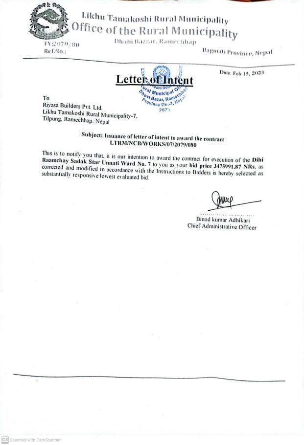» Letter Of Intent (LTRM/NCB/WORKS/07/2079/080 Dihi Raamchay Sadak Star Unnati Ward No. 7)