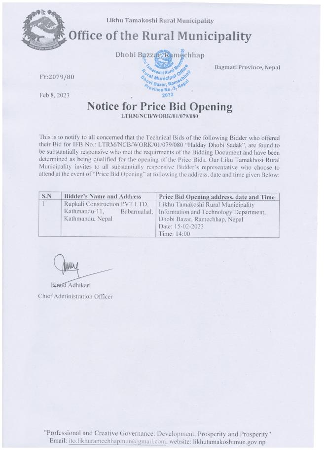 » Notice for Price Bid Opening LTRM/NCB/WORK/01/079/080 "Halday Dhobi Sadak"